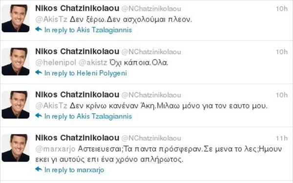 Απαντώντας σε προτροπή ενός «φίλου» στο κοινωνικό δίκτυο, να μιλήσει για όσα συμβαίνουν στο Alter, ο Νίκος Χατζηνικολάου έγραψε «Σε ποιο πράγμα να πάρω θέση; Για μένα η υπόθεση ALTER τελείωσε. Μετά τις γιορτές θα ψάξω για δουλειά στην τηλεόραση» δείχνοντας ότι θέλει να βάλος τέλος σε αυτό το κεφάλαιο. Στη συνέχεια της συζήτησης, ο Νίκος Χατζηνικολάου έκανε αναφορά στους εργαζομένους του καναλιού γράφοντας ότι ήταν εκεί «γι' αυτούς επί ένα χρόνο απλήρωτος».