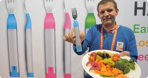 Ονομάζεται HAPIfork και είναι γεμάτο με αισθητήρες. Οι αισθητήρες μετράνε τις φορές που φέρνουμε το πηρούνι στο στόμα ανά λεπτό, τα διαλείμματα μεταξύ των μπουκιών και πόση ώρα μας πέρνει να τελειώσουμε το φαγητό.
